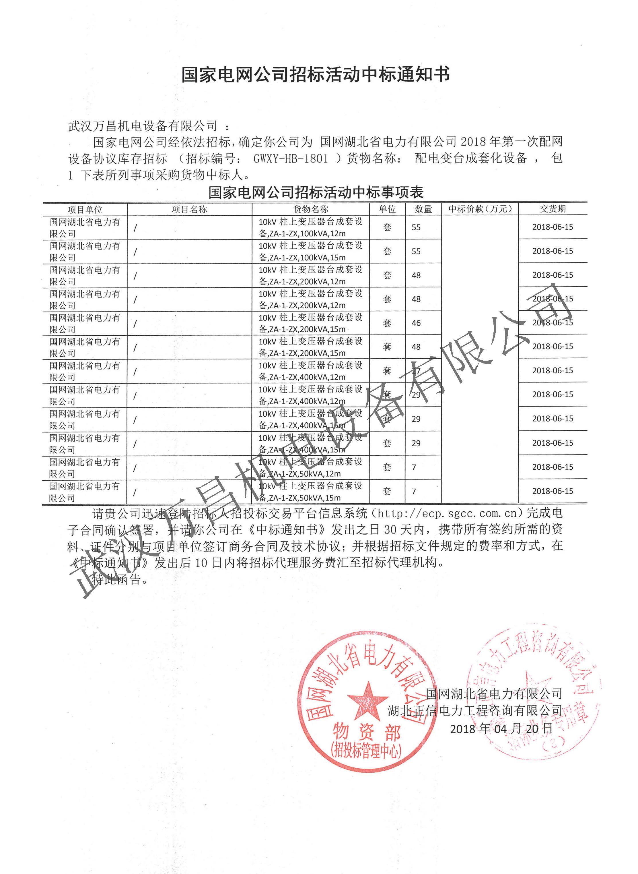 2018年中標國網(wǎng)湖北省協(xié)議庫存項目